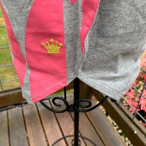 There are no sleeves and a rounded neckline. The bottom hemline is also rounded. The back is grey only but the front has QUEEN written in pink letters. It also has a gold crown applique on the bottom left front. Some of the pink is wore on the letters from age or maybe they were always like that?