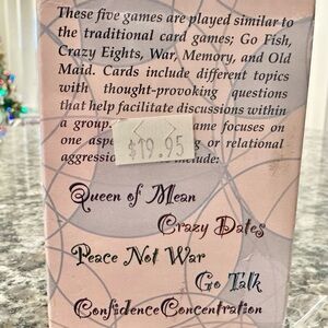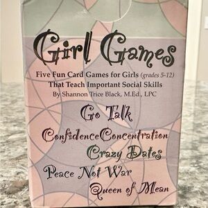 Five games in one box! Girl Games includes five decks of cards that are based on traditional card games. Each deck promotes self-esteem, teaches decision-making skills, and helps prevent bullying and relational aggression among girls. Games include: