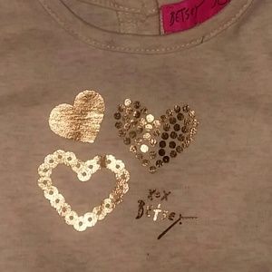 Gorgeous baby girls Betsey Johnson 3 piece outfit set size 6/9 months.New with tags.From a smoke/pet free home.Demin look jeggings cuffed ankles,elastic waistband with bronze button for looks engraved Betsey's name and pretty floral print.Matching long sleeve gray top with metallic gold hearts on front and adorable matching faux suede and burgundy vest.XOX Betsey Johnson embroidered in gold print on bottom left side.Front pockets with zipper closure a metal heart pull tab.Cute comfy n stylish M