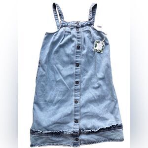 Chelsea & Violet girl's playful washed denim overalls dress. Front buttons and side pockets.
