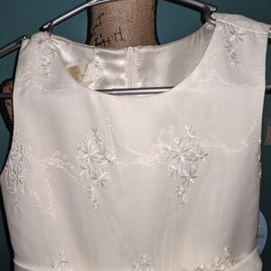 Elegant dress perfect for any special occasion. This sleeveless cream dress features a delicate floral applique design throughout, adding a touch of grace and charm. It boasts a satin-like sash at the waist, accentuated with a lovely flower detail. The dress is fully lined and designed with a concealed back zipper closure for easy wear. Ideal for flower girls, parties, or any formal event where a touch of sophistication is desired.