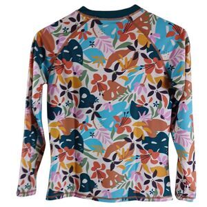This is a new with tags (NWT) girls' swim shirt from the brand Kid 1234 in size L-XL for 13-14-year-olds. The long-sleeve shirt features a floral pattern and provides UPF 50 sun protection. Made of spandex and nylon, it is machine washable and quick-drying. Perfect for the beach, flower, resort, vacation, nautical, palm, or coastal themed activities.