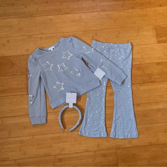 Charming blue set with star patterns. Includes top, pants, and headband. Perfect for playful days. NWT Girls Size 5 Blue Stars Outfit - LS Top & Flare Pants