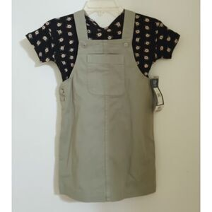 This dress & shirt set is size XS (4-5) and made by Gap. The jumper is made with 98% cotton and 2% spandex, the stretchy tee shirt is made with 100% cotton and they are both machine washable. This set is new with tags, might have some wrinkling with shipping. Very nice.