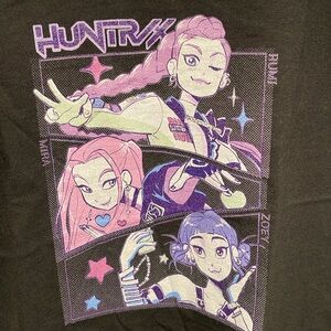 K-pop Demon Hunters 100% cotton black tee with a purple and pink graphic design of Huntr/x members Rumi, Mira, and Zoey. Girls style cut, not unisex, so it has a bit of a more fitted look with shorter sleeve length and a slightly rounded edge bottom. Brand new, never worn; we purchased 2 sizes and my daughter liked the bigger one a little better.