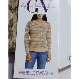 NWT Gloria Vanderbilt Fair Isle Sweater Womens Medium Tan Lurex Gold Thread