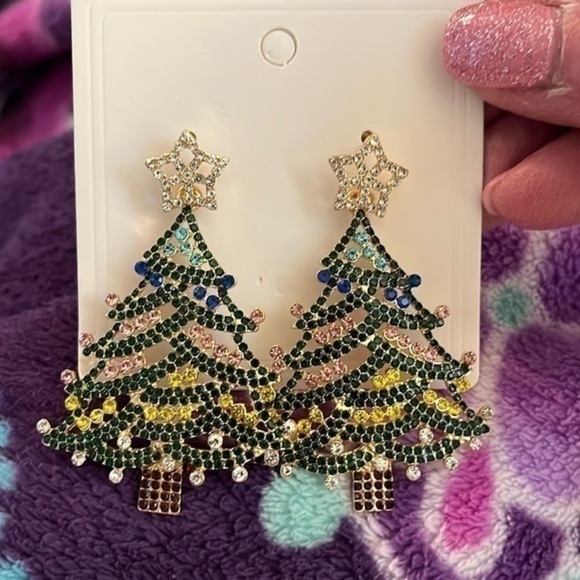 NWT Gold And Green Christmas Tree Earrings With Sparkling Colors