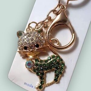 Sparkling gold tone cat keychain with green glass rhinestones on her body and ears. The kitty's tag is an AB rhinestone Perfect for adding charm to your keys. take the clips and rings off and these make gorgeous accessories for a rearview mirror or even a Christmas tree!