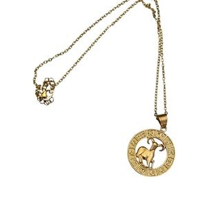 Super fun gold pendant necklace featuring a zodiac design. Perfect for adding a touch of sophistication to any outfit.