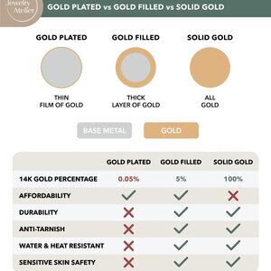 Why Gold Filled? - If you are concerned about the tarnishing effect of gold plated jewelry, and you desire the quality of solid gold, then you’ll be satisfied with Jewelry Atelier’s gold filled products. They are affordable, durable, strong, heat and water resistant, and safe for your skin, also they won't tarnish with time.