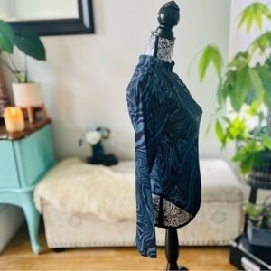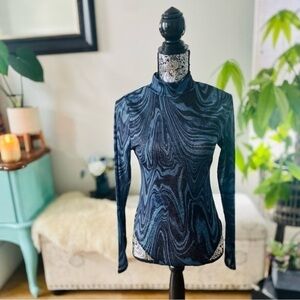 Features a sheer mock neck blue swirl print
