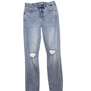 Elevate your style with these classic blue distressed jeans. Perfect for a casual day out.