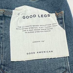 Good American Good Legs skinny jeans in a classic medium blue wash. This iconic style is designed with super stretch denim that sculpts and smooths while maintaining comfort and shape. Features a flattering high-rise waist with Good American’s gap-proof waistband and flat tummy technology.