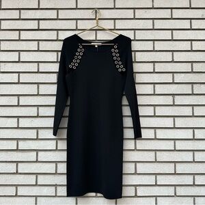 Edgy meets elegant in this NWT Good American grommet rib knit bodycon dress. Crafted from a dense stretch knit that hugs curves while keeping you comfortable, this little black dress features polished gold-tone grommets at the shoulders, a crew neckline, and long raglan sleeves. The unlined, midweight ribbed knit fabric flatters with a slimming silhouette, hitting at knee length for a chic, cocktail-ready look. Easy slip-on style makes it perfect for nights out, holiday parties, or any occasion where you want a confident statement piece. Original tags still attached.
