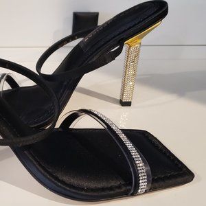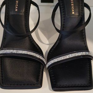 NWT: Good American Open Square Toe Rhinestone Strappy Heels Black Satin SZ 8