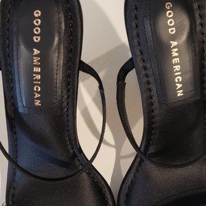 Elevate your style with these stunning black satin strappy heels from Good American. The ultra-high stiletto heel adds a touch of glamour to any outfit, while the rhinestone accents provide a subtle sparkle. The open square toe and slip-on closure make these shoes both fashionable and comfortable, perfect for a night out on the town.
