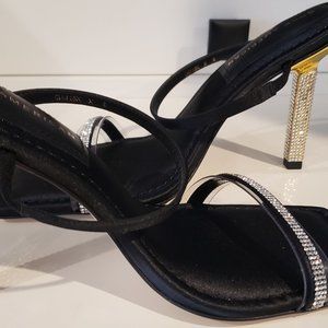NWT: Good American Black Open Toe Satin Rhinestone Heel and Toe Sling back Pumps
