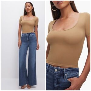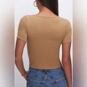 Sleek tan fitted top. Short sleeves. Square neckline. Perfect for casual wear.