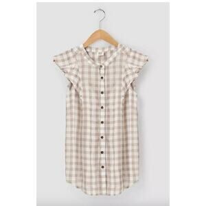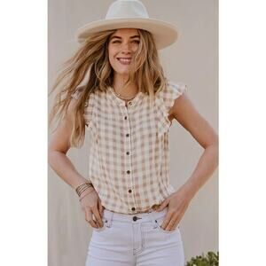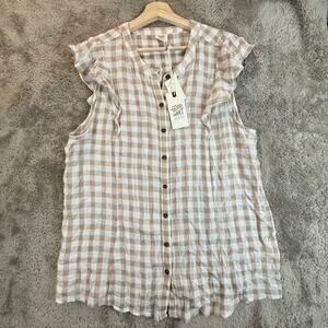Good Hart Matilda Jane Gingham McNay Sleeveless Top XL Extra Large Beige White Flutter Sleeve Button Down Blouse Shirt Shabby Chic