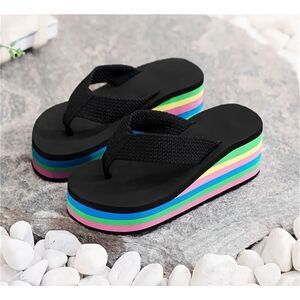 Black Rainbow 80’s Style Wedge Platform Comfy Flip Flop Sandals