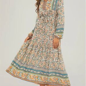 NWT! This dress is gorgeous! This boho style midi dress has a beautiful floral print in blue, gold, beige. It has a thin tie belt and the waist. The neck also ties. This dress can be worn for many occasions! A festival, for Easter, at work, or a wedding...you name it! And it's 100% soft cotton fabric!! This is a Women's EU size 8 (US Size 6)