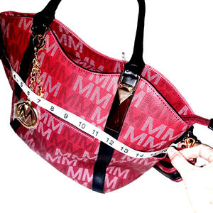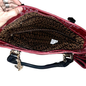 Brand new with Tags - Gorgeous Cranberry Color with black straps and gold buckles & zippers plus butterfly and monogram in Gold - Medium Size MKF Signature Purse. 16 inches across - THE perfect medium size purse with top handles and also long strap that is detachable.