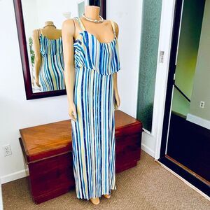 NWT Gorgeous Design 365 Sz L Blue/Yellow/ Green Mint/White striped Maxi dress
