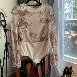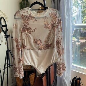 NWT, Gorgeous Keep On Rollin Sequin Bodysuit in Rose Gold, Size Medium