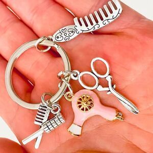 Pink & Silver Metal Hairdresser, Hairdryer, Scissors, Combs & Brush Keyring Key holder