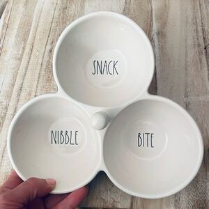 NWT Gorgeous Rae Dunn white Ceramic set of 3 attached bowls SNACK BITE NIBBLE
