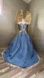 The gown features a strapless bodice with a floral pattern in shades of blue and white, transitioning into a voluminous, light blue skirt.