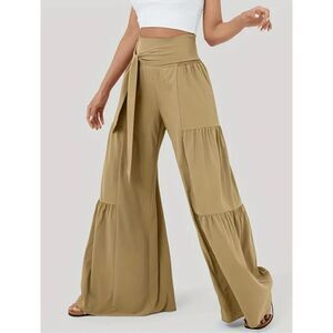 High Waisted Tan Tie Front or Back Wide Leg Flowy Tiered Pants