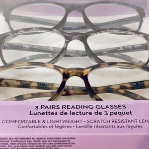 Includes three pairs of plastic frame readers in 3 fashionable colors