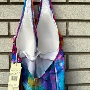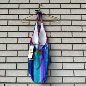 One-piece swimsuit adorned with a colorful watercolor pattern. Halter neckline Halter straps tie in back Removable soft cups Full seat coverage. Pull-on style. 73% polyamide/27% elastane. Lining: 82% polyamide/18% elastane. Size 6.