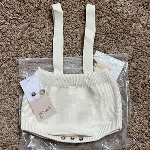 Brand new with tags Goumi Kids knit suspender bloomers size 6-12 months in Cloud. We love these bloomers for all year round! Can be layered for Spring/Fall and worn with a lightweight onesie in Summer.