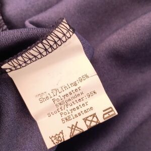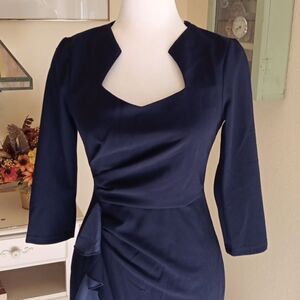 This stunner is ready for a beautiful experience. Look at this neckline.Deep navy blue. Pleats at the waist. A wide ruffle goes down the right side. Long sleeves. Back zip. The inside of this fabric is soft against your skin. Size S measures 34 at chest, 27 at waist, and 38 at hips. 32 at the bottom hem, with a vent. 40 long from shoulder to hem. The last two photos show this dress in white and light blue. You won't be disappointed.