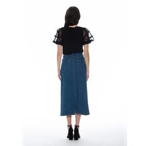 This Gracia high-waisted midi skirt brings a modern, structured edge to the classic jean look. Featuring large utility front pockets, a front slit, and a flattering straight silhouette, it transitions seamlessly from weekday casual to weekend chic. Pair with a puff-sleeve blouse or a cropped knit for an effortlessly elevated vibe.