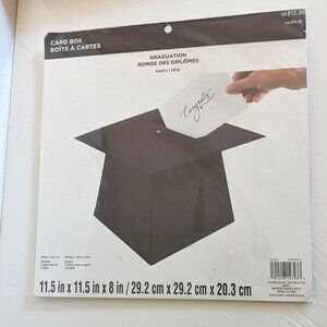 An assemble-it-yourself graduation hat shaped box to collect congratulations cards for the graduate, Michael's brand. This unique graduation decor item measures: approx 12" square base x 8" tall once assembled, and is new in package. Perfect for a college or high school graduation party!
