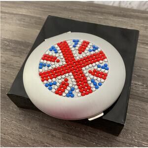 This is a brand new Graham Webb silver mirror compact, perfect for on-the-go touch-ups! The top features a stylish rhinestone flag design, adding a touch of sparkle and patriotism. It's a must-have accessory for any handbag or travel kit.