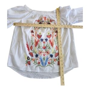 Brand new with tags! This Grand & Greene women’s off-shoulder blouse features vibrant multicolor floral embroidery for a bold, bohemian look. Made from lightweight white fabric, it has 3/4 sleeves with charming red pom-pom trim and an elastic neckline that can be worn off the shoulder. Perfect for summer festivals, beach vacations, or casual outings. Size Small.