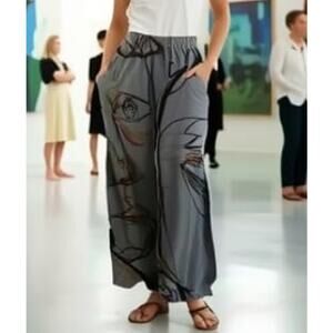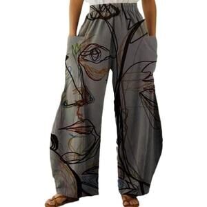 NWT ~ Gray Abstract Pockets Wide Leg Loose Casual Pants ~ Women's Size LARGE