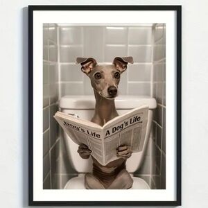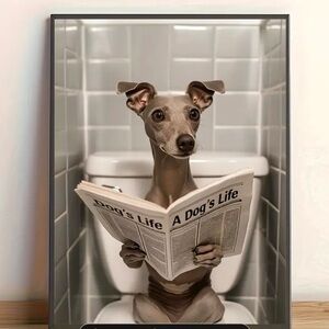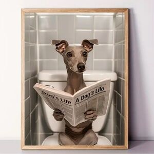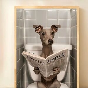 Whimsical yet elegant canvas print of “blue” gray Sighthound Whippet Greyhound IG Italian Greyhound dog puppy on toilet reading magazine Perfect decor addition for any bathroom or room in your home.