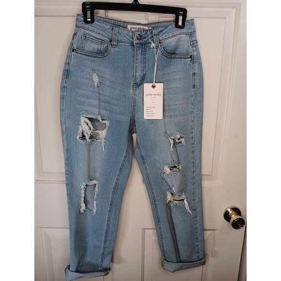 NWT Great Smoky Los Angeles Crop Jeans in size 3 feature a light indigo color with ripped legs and a slim, high-rise fit. Made of a blend of spandex and cotton denim fabric, these skinny jeans have a zip and button closure, distressed details, pockets, and offer stretch for comfort. Ideal for juniors, these jeans have a 25.5-inch inseam and are suitable for summer, fall, and spring seasons.