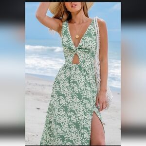 Elegant green floral maxi dress with a deep V-neck and side slit. Perfect for beach outings.