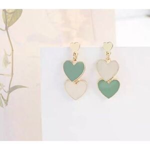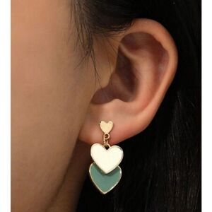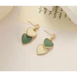 NWT Green Milky White Two-Toned Double Heart Boho Dangle Earrings