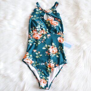 TEAL FLORAL SCALLOPED ONE-PIECE SWIMSUIT
