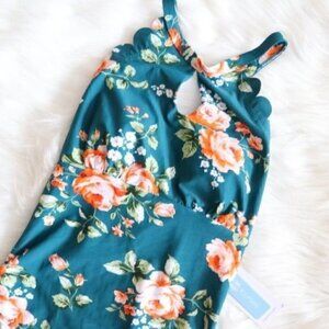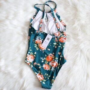 NWT Green One Piece Bathing Suit Size XS Orange Floral Print Scalloped