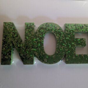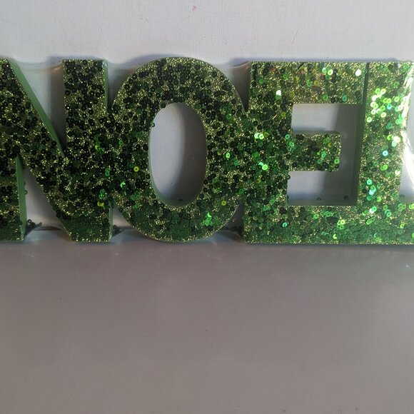 Fun, NWT green sequin and glitter 'Noel' block letter sign, by Michael's. This festive, modern sign measures approx 16" in length, 6" tall and less than 1" deep, is new in packaging, and makes a great holiday decoration, or a Xmas gift for someone special!