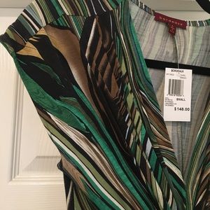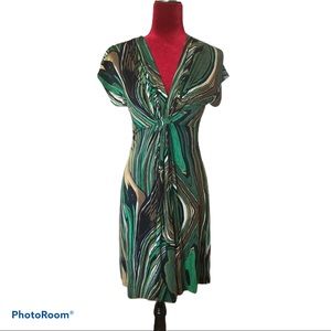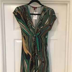 NWT size small green/tan patterned cap sleeve Bordeaux dress, I love this dress! It is stunning on and fun! The colors are a beautiful combination. The fabric is soft and stretchy. Total length of dress from shoulder to hem is approx 35 1/2 inches.
