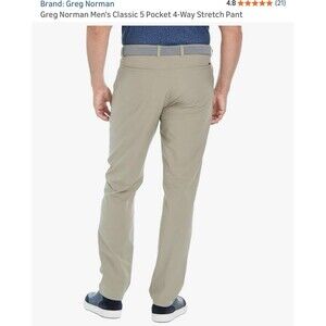 The NWT Greg Norman Ultimate 5 Pocket Men's Stretch Golf Pants in Olive Green are perfect for a casual occasion with a touch of sporty flair. Made from a durable microfiber fabric with a mid-rise and flat front design, these 34x34 pants feature slash pockets and a straight leg style. The stretch material ensures comfort and flexibility, making them ideal for summer and spring seasons. The olive green color and Greg Norman logo accents add a stylish touch to these practical and versatile pants.